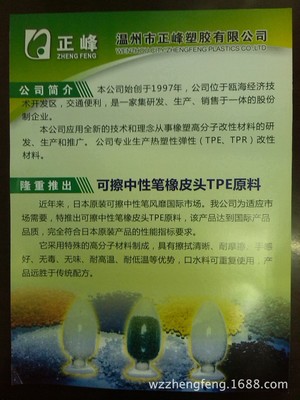 近年來,日本原裝可擦中性筆風靡國際市場。我公司為順應市場需要,特推出可擦中性筆橡皮頭TPE原料,該產(chǎn)品國際產(chǎn)品品質(zhì),完全符合日本原裝產(chǎn)品的性能指標要求。